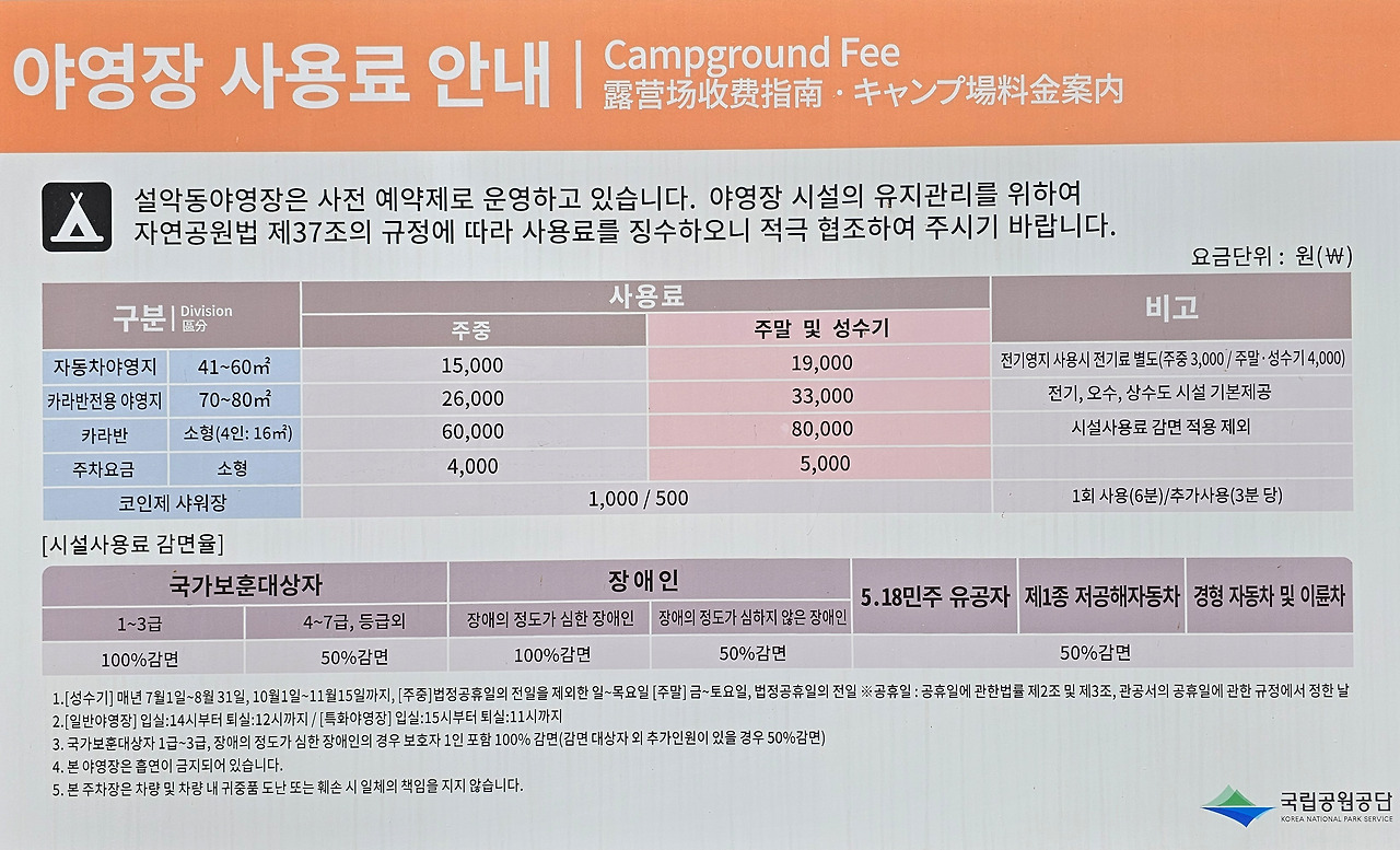 설악동 야영장은 예약제로 운영되어지고 있다. 야영장 곳곳에 취사장이 설치돼 있어 어느 블로에 자리를 잡아도 불편하지 않다. 또 샤워실과 화장실이 깨끗하게 관리되고 있어 더욱 편리하다.