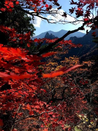 단풍은 대쳥봉과 같이 높은 고도부터 시작해 점차 산 아래로 내려오며, 약 한 달간 설악산을 물들입니다. 특히 설악산 단풍 절정시기에는 많은 등산객과 관광객이 몰리기 때문에 혼잡을 피하고 싶다면 평일에 방문하는것을 추천합니다.