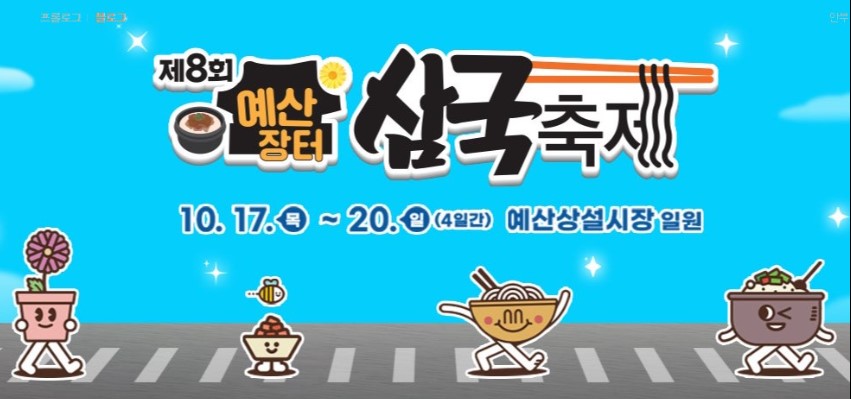제8회 예산장터 삼국축제가 10월 17일(목)~20일(일)까지 4일간 예산상설시장 일원에서 국화향 가득한 축제가 열립니다. 삼국의 의미는 국화, 국밥, 국수로 오셔서 맛있는 삼국을 만끽하시면 후회하지 않을 거라 생각합니다. 자세한 일정 알려드리겠습니다.